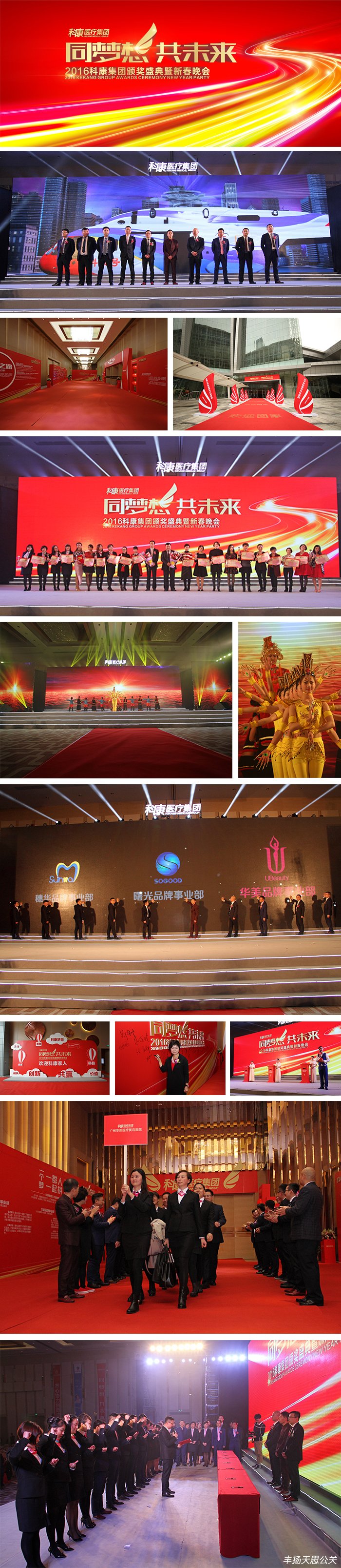 2016年1月31日,由豐揚天思傾力打造的“同夢想,共未來”——2016科康集團頒獎盛典暨新春晚會在廣州南豐朗豪酒店隆重舉行。來自全國各地的科康家人、集團高管、商業精英人士近一千兩百人匯聚盛典現場,共同見證盛會的舉行。