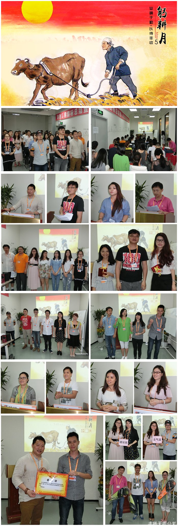 總結3月、4月的工作成果,確定5月、6月的工作目標。2015年5月8日“躬耕月”月度工作總結暨目標啟動大會在廣州總部揭開帷幕,公司管理層以及豐揚天思廣州策劃公司各事業部門,創業部、行政部、財務部、采購部、后勤保障部、制作部、以及部分加盟、聯盟、分公司代表等參加了本次會議。