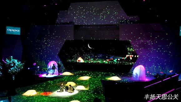 舞臺后區的全息影像結合舞臺前區投影,立體呈現了一個極具縱深感的郊外夜景。