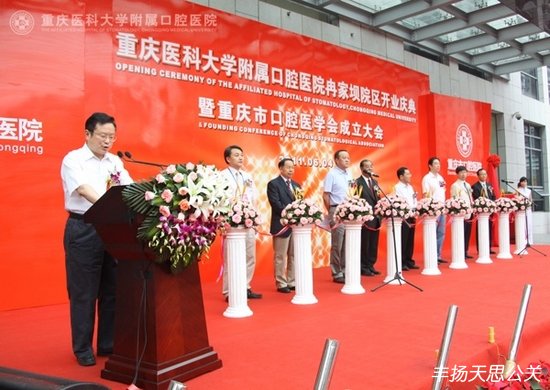 2011年6月4日上午,重慶醫(yī)科大學(xué)附屬口腔醫(yī)院冉家壩院區(qū)開業(yè)慶典暨重慶市口腔醫(yī)學(xué)會(huì)成立大會(huì)在冉家壩院區(qū)隆重舉行。重慶市政府副市長(zhǎng)吳剛、中華口腔醫(yī)學(xué)會(huì)會(huì)長(zhǎng)王興、重慶市衛(wèi)生局黨組書記夏永鵬、重慶醫(yī)科大學(xué)黨委書記吳小翎等領(lǐng)導(dǎo)出席了開業(yè)儀式并剪彩。參加開業(yè)慶典暨重慶市口腔醫(yī)學(xué)會(huì)成立大會(huì)的嘉賓還有中華口腔醫(yī)學(xué)會(huì)王渤秘書長(zhǎng)、北京大學(xué)口腔醫(yī)院張祖燕副書記、四川大學(xué)華西口腔醫(yī)院趙志河副院長(zhǎng)、首都醫(yī)科大學(xué)王松靈副校長(zhǎng)、武漢大學(xué)口腔醫(yī)學(xué)院樊明文院長(zhǎng)等全國(guó)各大口腔醫(yī)院和醫(yī)學(xué)院的院長(zhǎng)、專家、知名學(xué)者和院老專家、職工代表共200余人。重慶市衛(wèi)生局局長(zhǎng)屈謙主持了開業(yè)典禮。